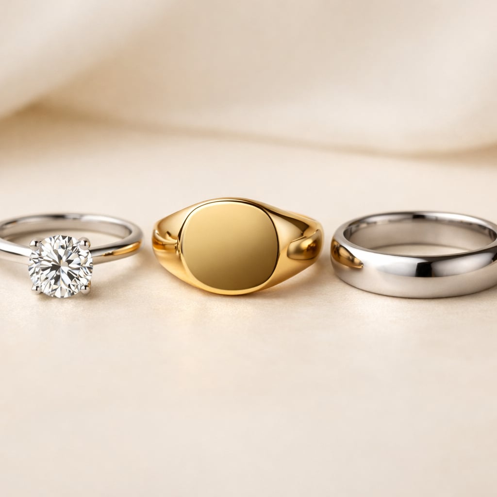 We work with eight makers across Europe. Every piece is finished by hand and signed inside the band. Lifetime resizing, lifetime polishing, lifetime care — included.