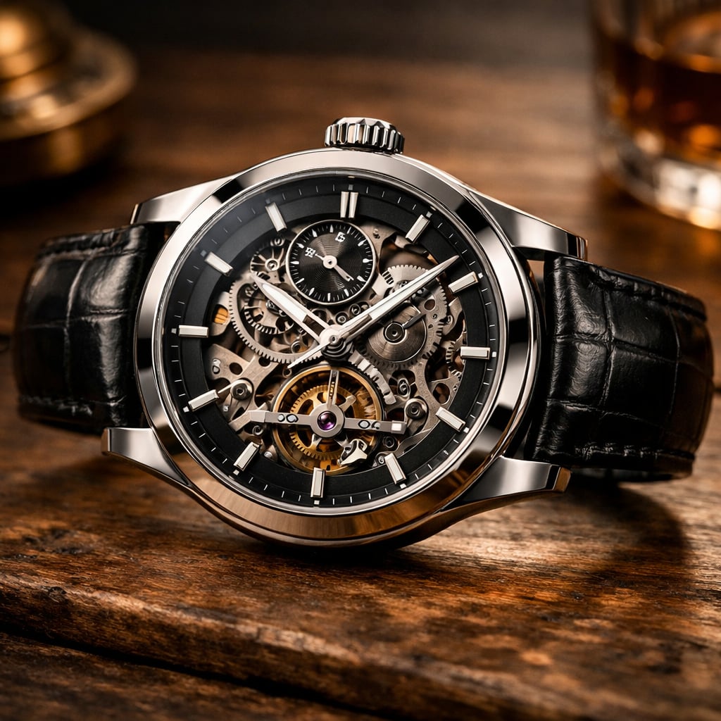 Sapphire crystal, automatic Swiss movement, 100m water resistance.